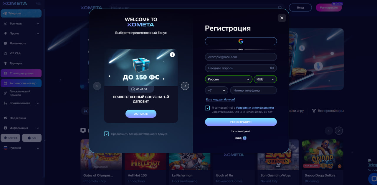 Создайте аккаунт в Комета Казино и получите бонус на первый депозит для старта игры